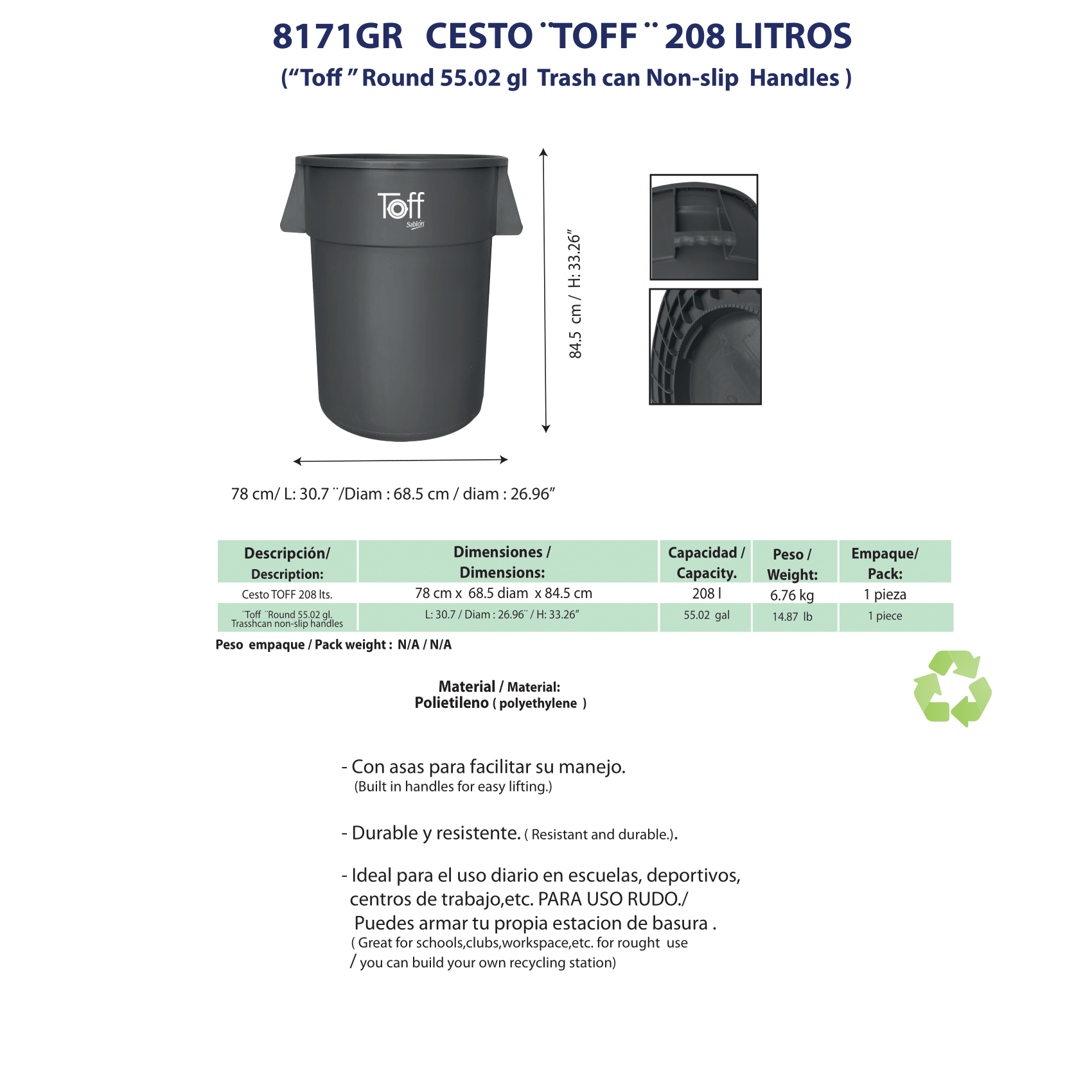 8171GR Bote de basura Toff 208 litros